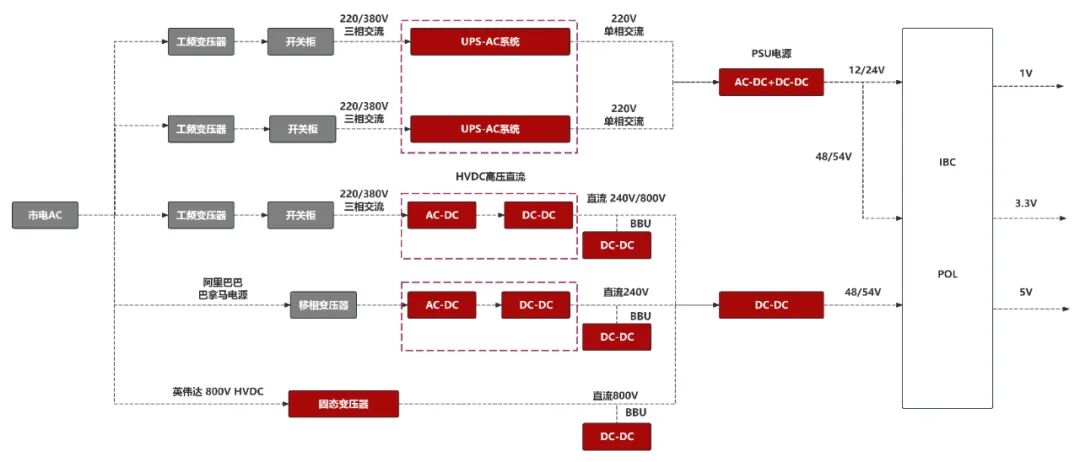 當(dāng)前主流AIDC供電架構(gòu)采用"交流變直流,電壓逐步降"模式:電網(wǎng)10kV-20kV高壓交流電經(jīng)變壓器降至380V三相交流,再通過不間斷電源(UPS)和服務(wù)器電源(PSU)轉(zhuǎn)換為48V/12V直流。